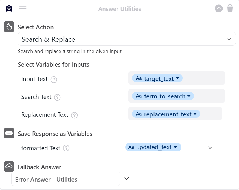 The Search & Replace action does exactly what its name suggests; it searches a body of text for a specific item, such as a term or a phrase, and replaces it with new text! Setup is quick and easy. You can define a static bit of text or use a variable to allow for text that can be updated depending on the scenario.