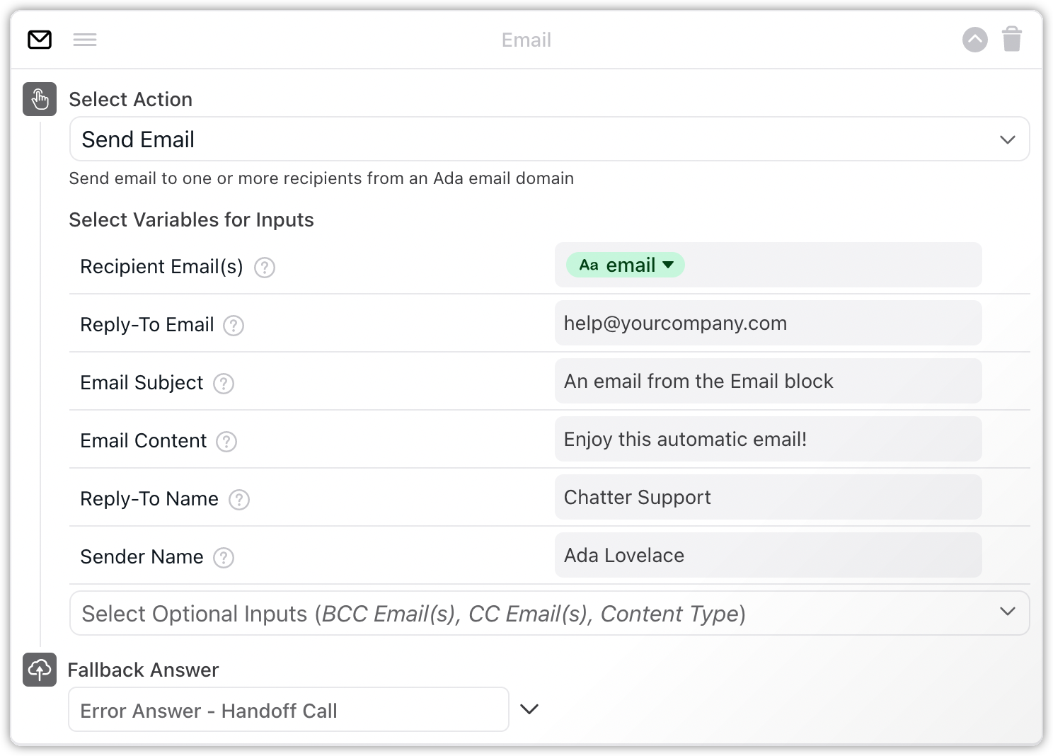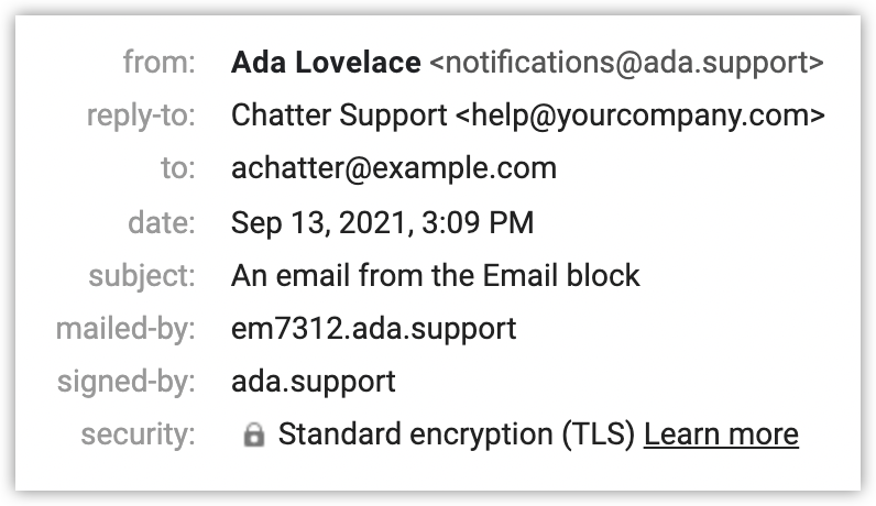 All emails sent using the Email block originate from Ada, and show an Ada email address as the sender email. You must specify a separate reply-to email address—Ada does not handle email replies from your chatters. You can also customize the sender name, reply-to name, and more.