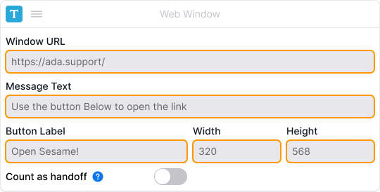 The Web Window block also has a Count as a Handoff toggle, similar to the Link block. Toggle this on if you would like to consider all link clicks for this block as a handoff in your analytics.