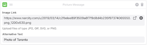 A Picture content block allows you to link to an image or upload it directly from your files. This content block can accommodate JPG, GIF, SVG or PNG, and includes an alternative text field.