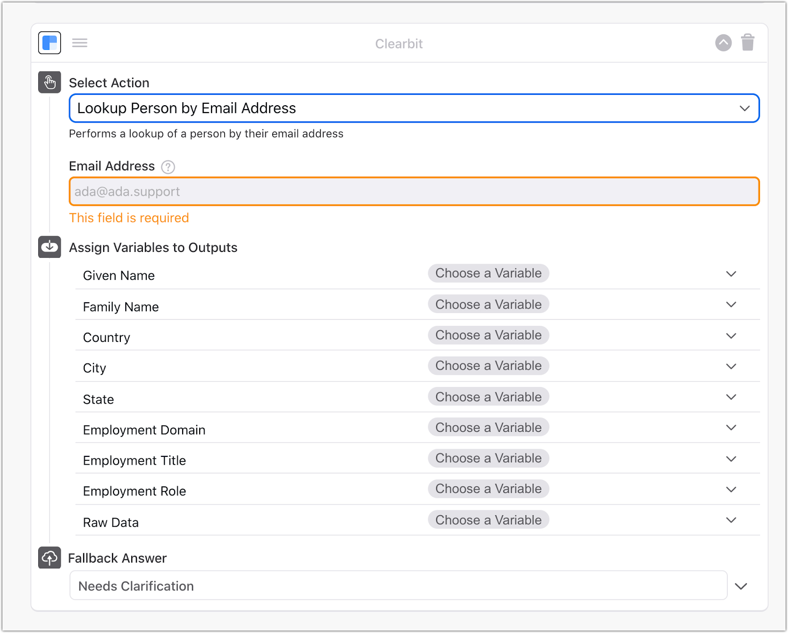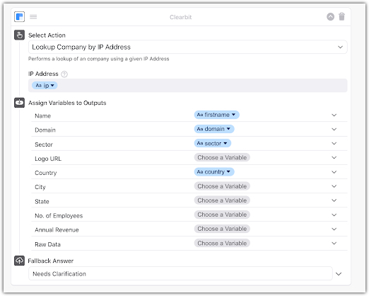 The action you select will define the variables you need to assign to the Clearbit outputs.