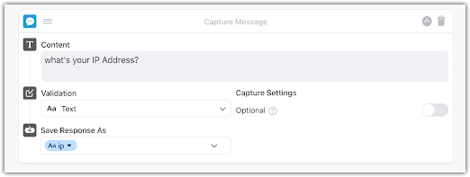 Before inserting the Clearbit Action block, drag in a Capture block, which is needed to record the input variable. In Clearbit’s case this is either email address, or IP address.