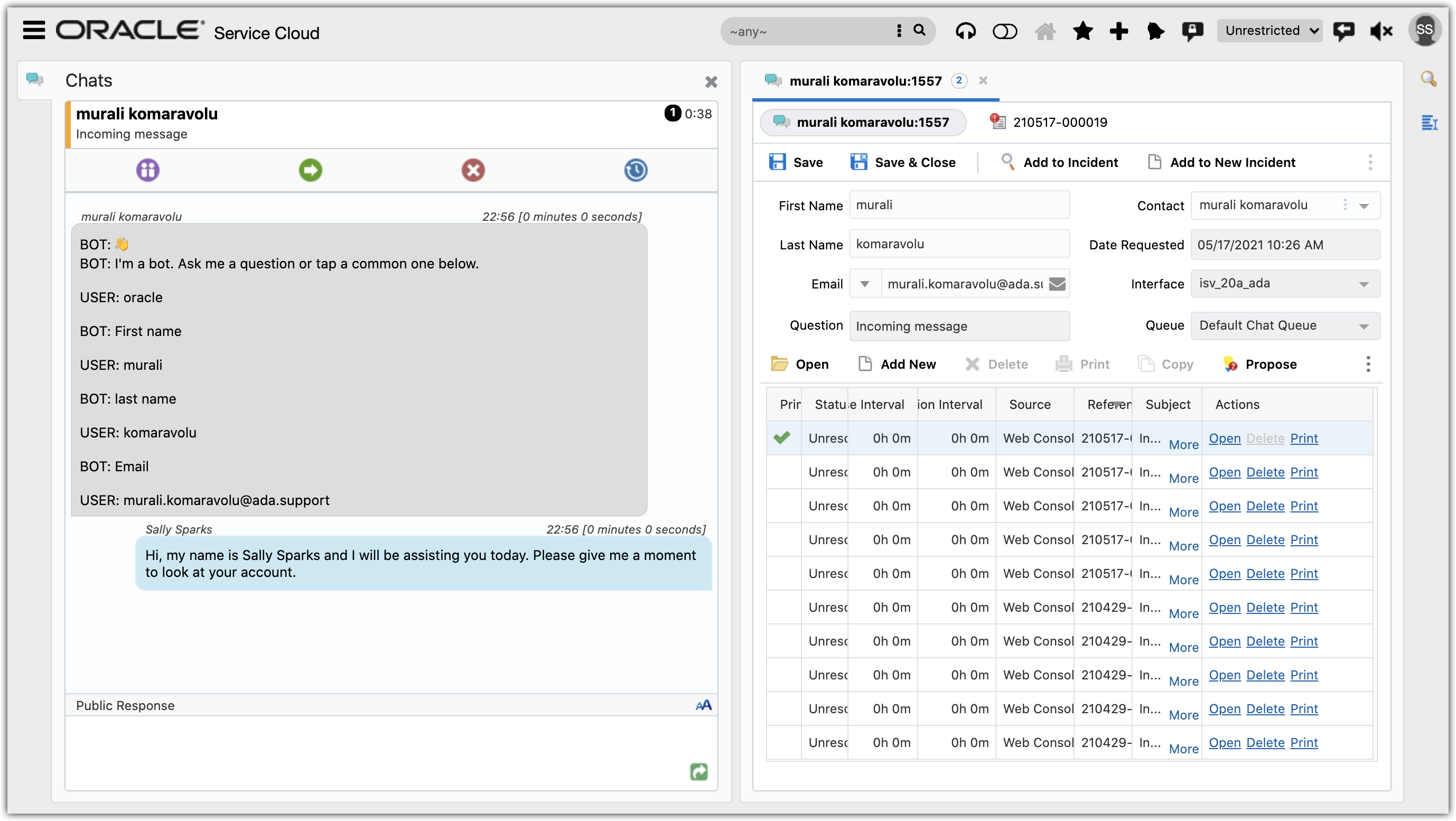 The chat window becomes present for the agent with the full transcript, at this point the agent can reply back to the conversation. The contact record is also created if not already present in Oracle. If the contact record is present, it is presented to the agent.