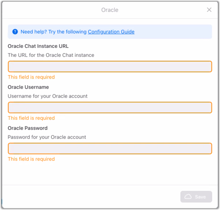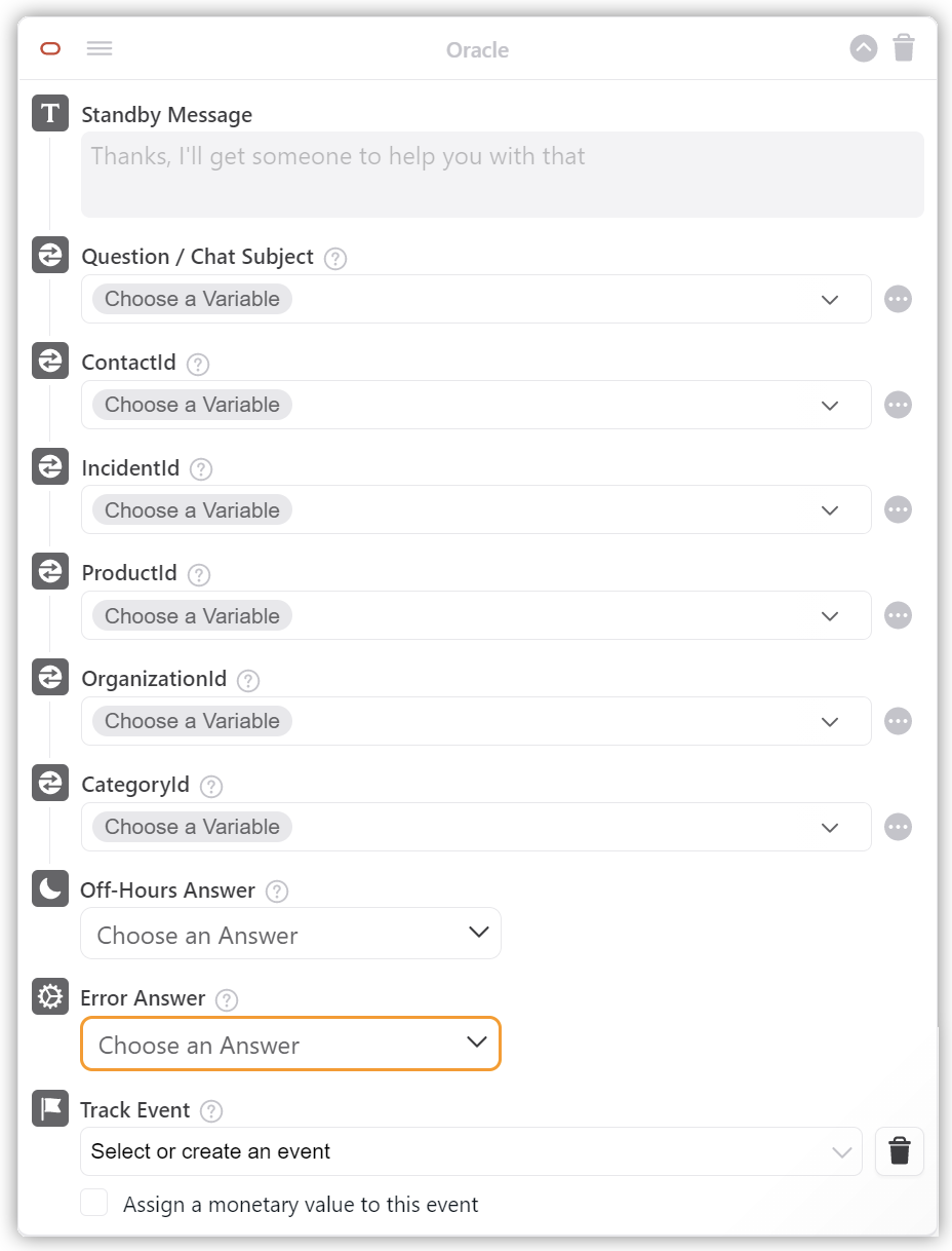 The Oracle block is made up of a series of fields for the various parameters you can define when creating the Oracle live support ticket. As such, your Oracle live support handoff Answer should be built to gather whatever information you need from the chatter for a successful handoff.