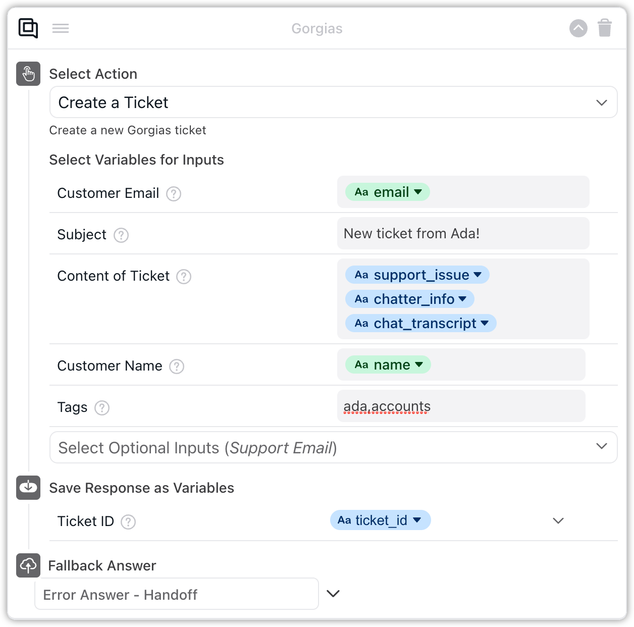 Now let’s put it all together. Here is how to build a handoff to Gorgias Ticketing Answer: