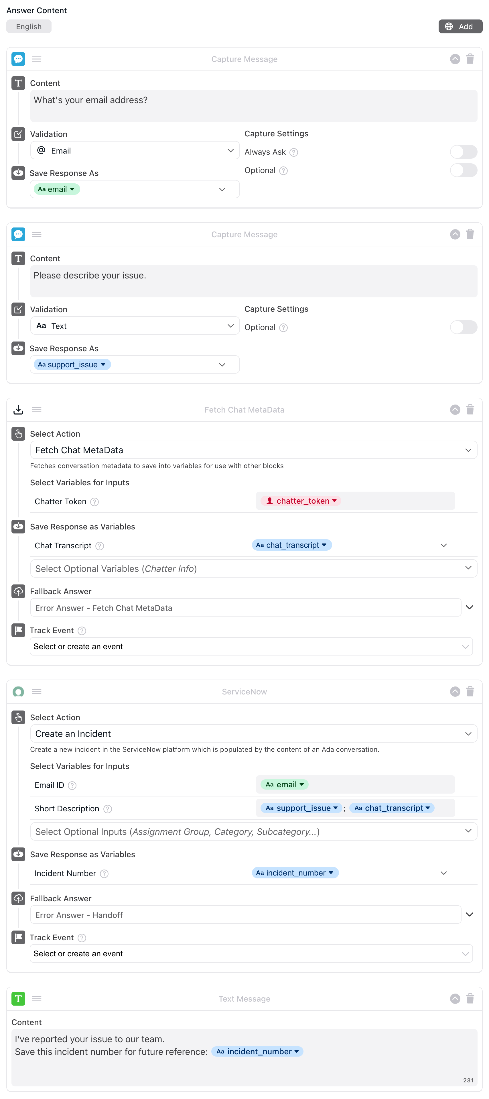 Your ServiceNow Answer must include blocks positioned to capture this information before the ServiceNow block. A typical setup serves the blocks in this order: