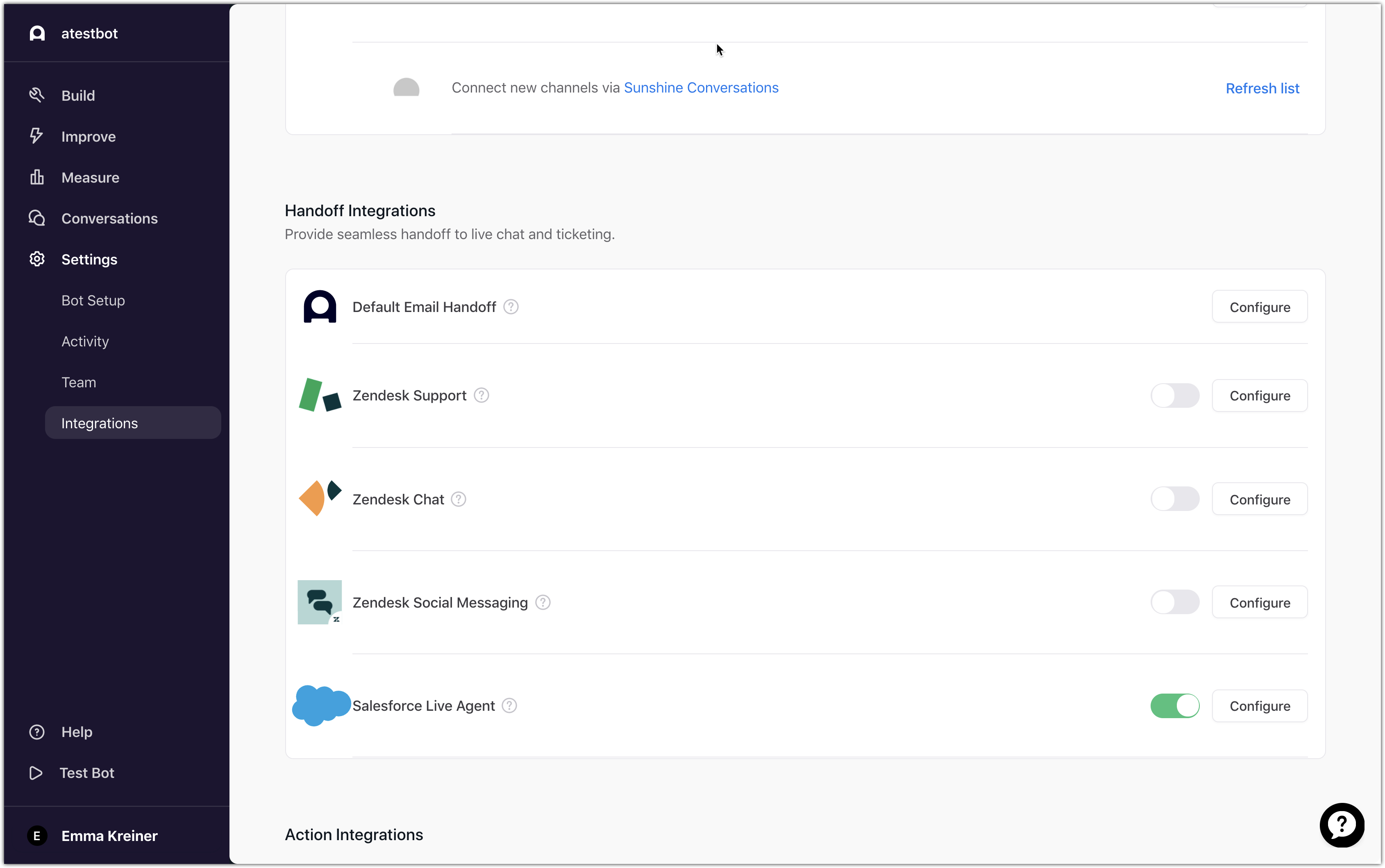 In Ada, access the Salesforce Live Chat Settings by opening the following path: Settings > Integrations > Configure within Salesforce Live Agent.