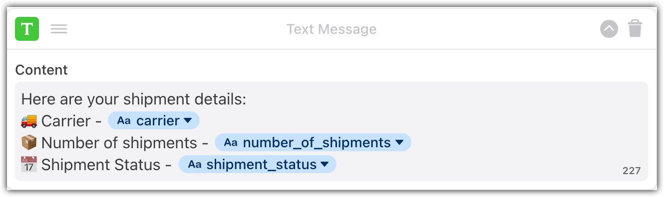 When the Convey block is triggered in your Answer, the variables you’ve set to receive the shipping information can be used to relay that information to the chatter. The simplest way is to use a Text Block.