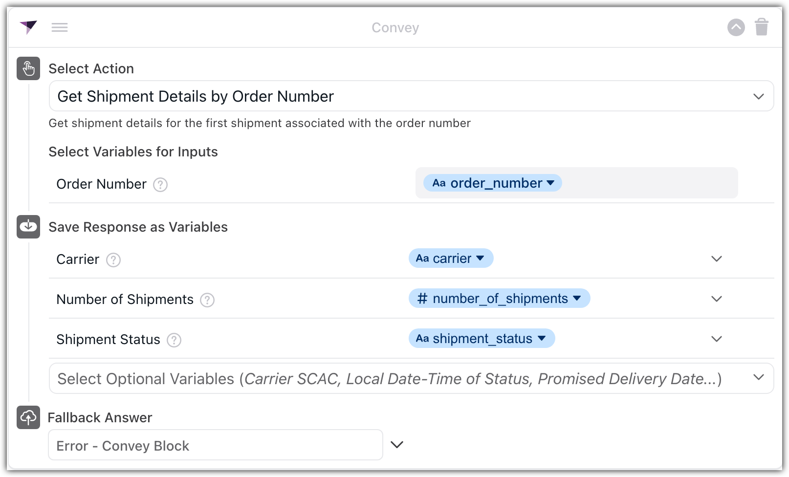 The Convey block is now configured to retrieve the shipping information you’ve chosen.