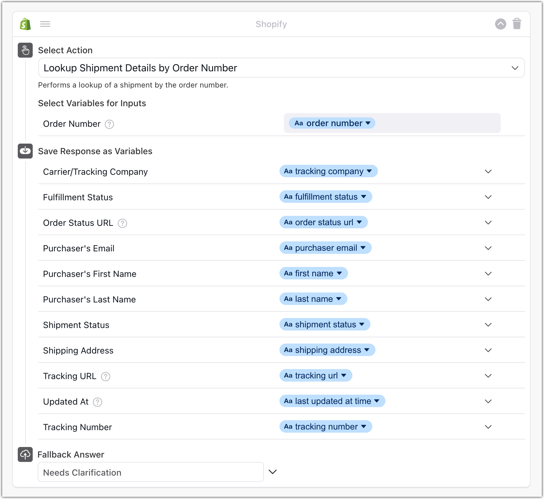 Select this action if your Answer flow involves chatters sharing their Order Number and using it to track orders.
