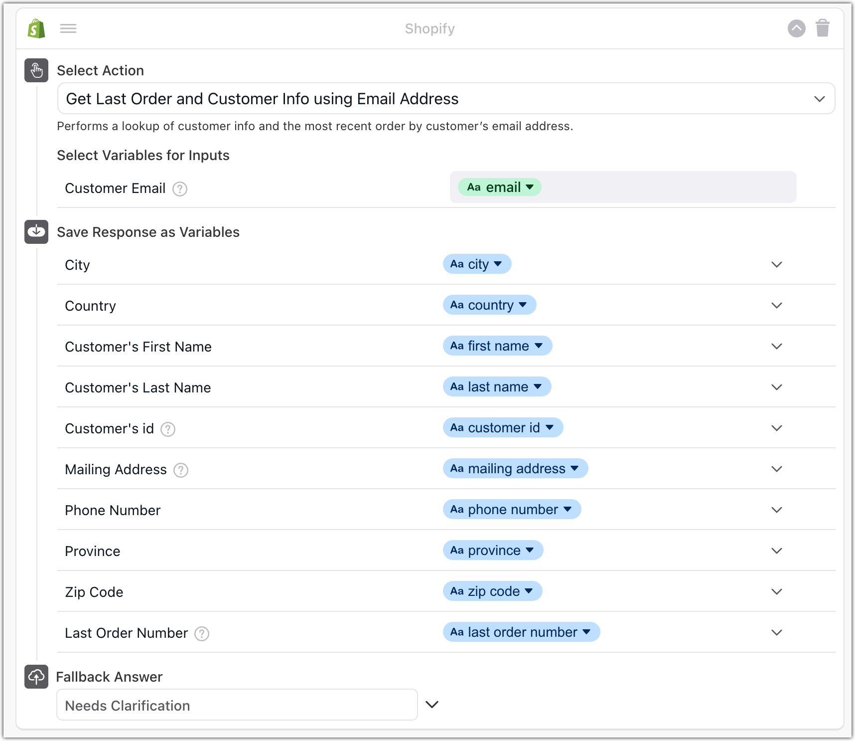 Select this action if your Answer flow involves chatters who don’t know their order number, and thus use their email address to track their orders. In case that the chatter doesn’t have an Order ID, the other way to enable a chatter to find their last order number is using their email ID.