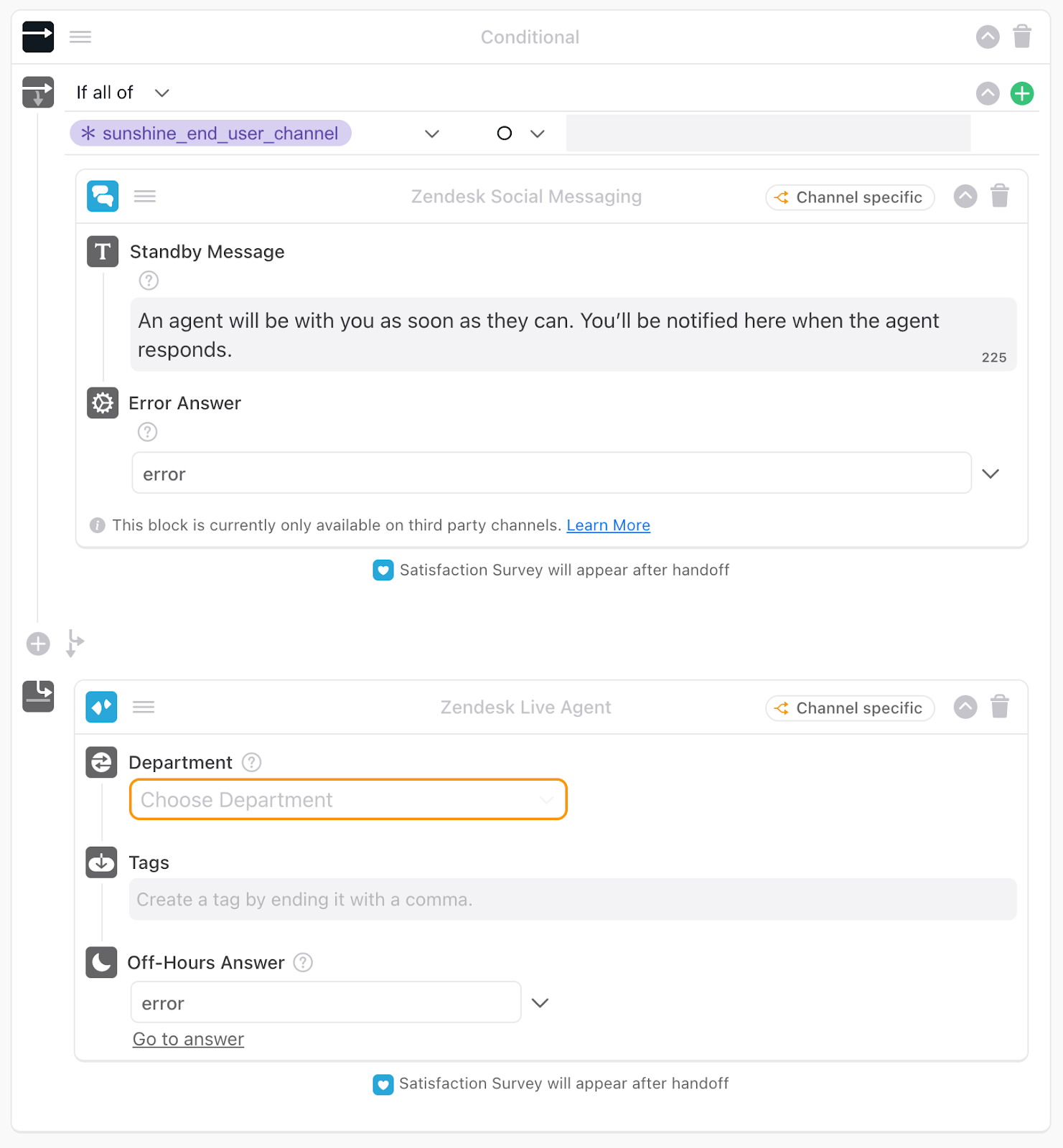 Satisfaction Survey: Sunshine Conversations Web Messenger doesn’t support Ada’s Satisfaction Survey block. However, you can use Zendesk Messaging’s survey feature, which asks chatters about their experience once the agent marks the conversation as Solved. For more information, see About CSAT ratings in messaging at Zendesk Messaging’s documentation.