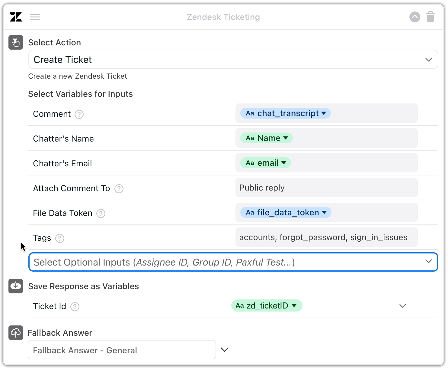 Under Fallback Answer, select an Answer to serve your chatters in case of a connection error with the Zendesk API.