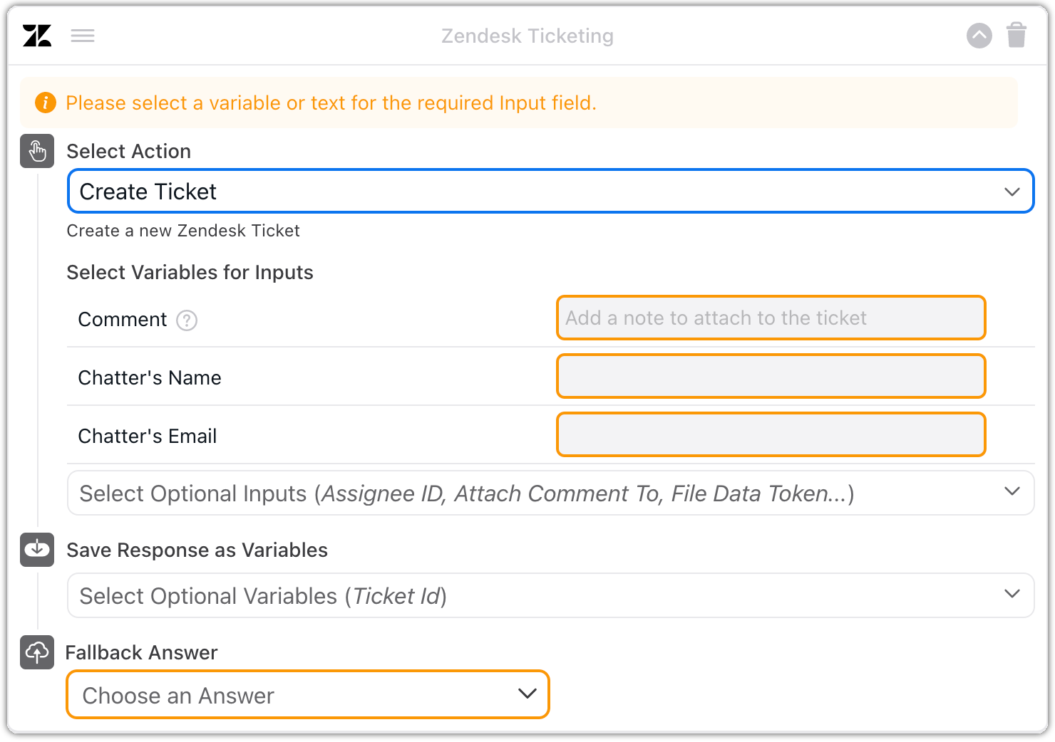 The Name and Email variables are critical requirements. Without them, the Ticketing app is not considered complete and the Save button won’t illuminate. Though Support Issue is not a block requirement, in most cases it is essential that you capture this information. Without it, the Zendesk agent assigned to the ticket may not know what the support request is about.