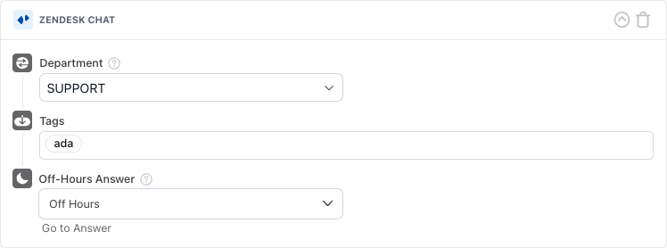 adaas a tag, so you can differentiate where the chat and ticket came from, if you have live chat available in channels other than Ada. - In the Off-Hours Answer list, select the Answer to serve if a chatter tries to speak with a live agent outside of your support hours.