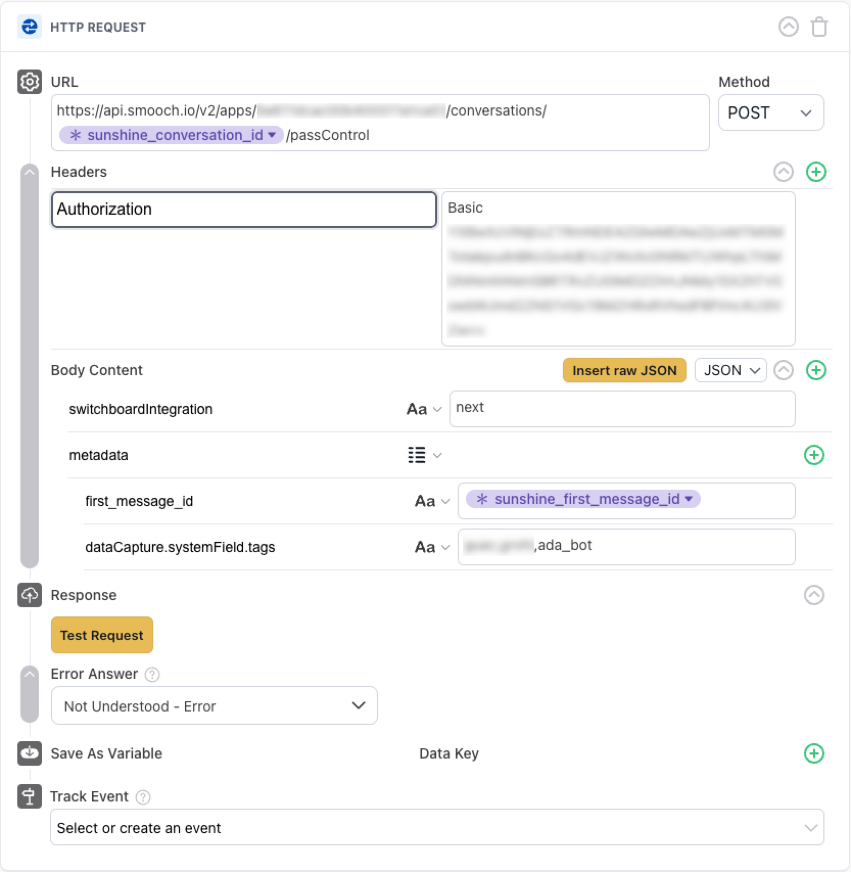 Rather than the usual platform-specific handoff blocks used elsewhere in Ada, if you’re using Sunshine Conversations Web Messenger, you need to create handoffs using API calls.