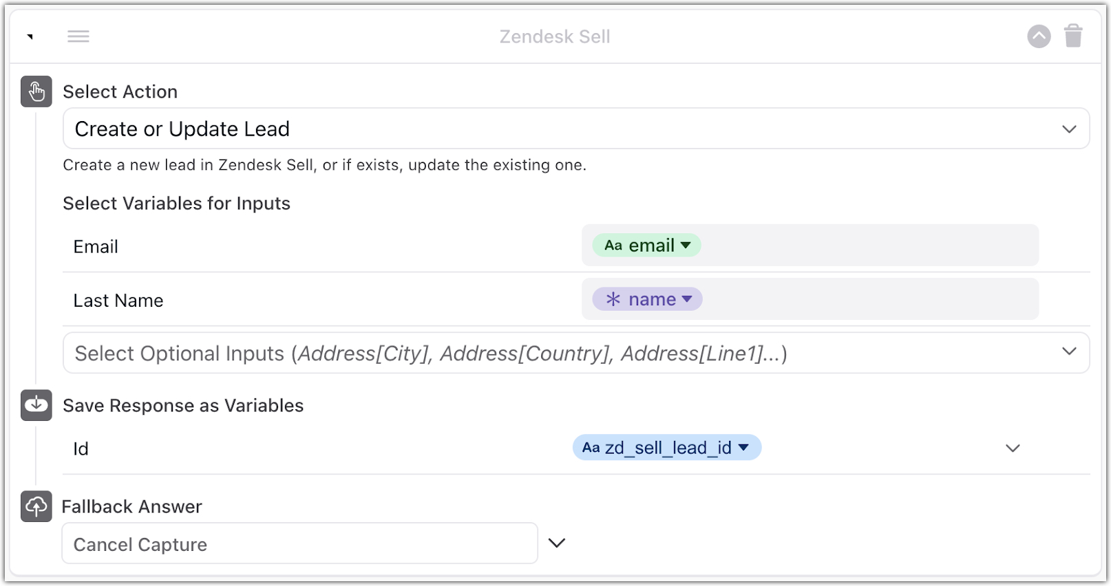 In the Select Optional Inputs dropdown, select any other field from Zendesk Sell you want to map Ada variables to.