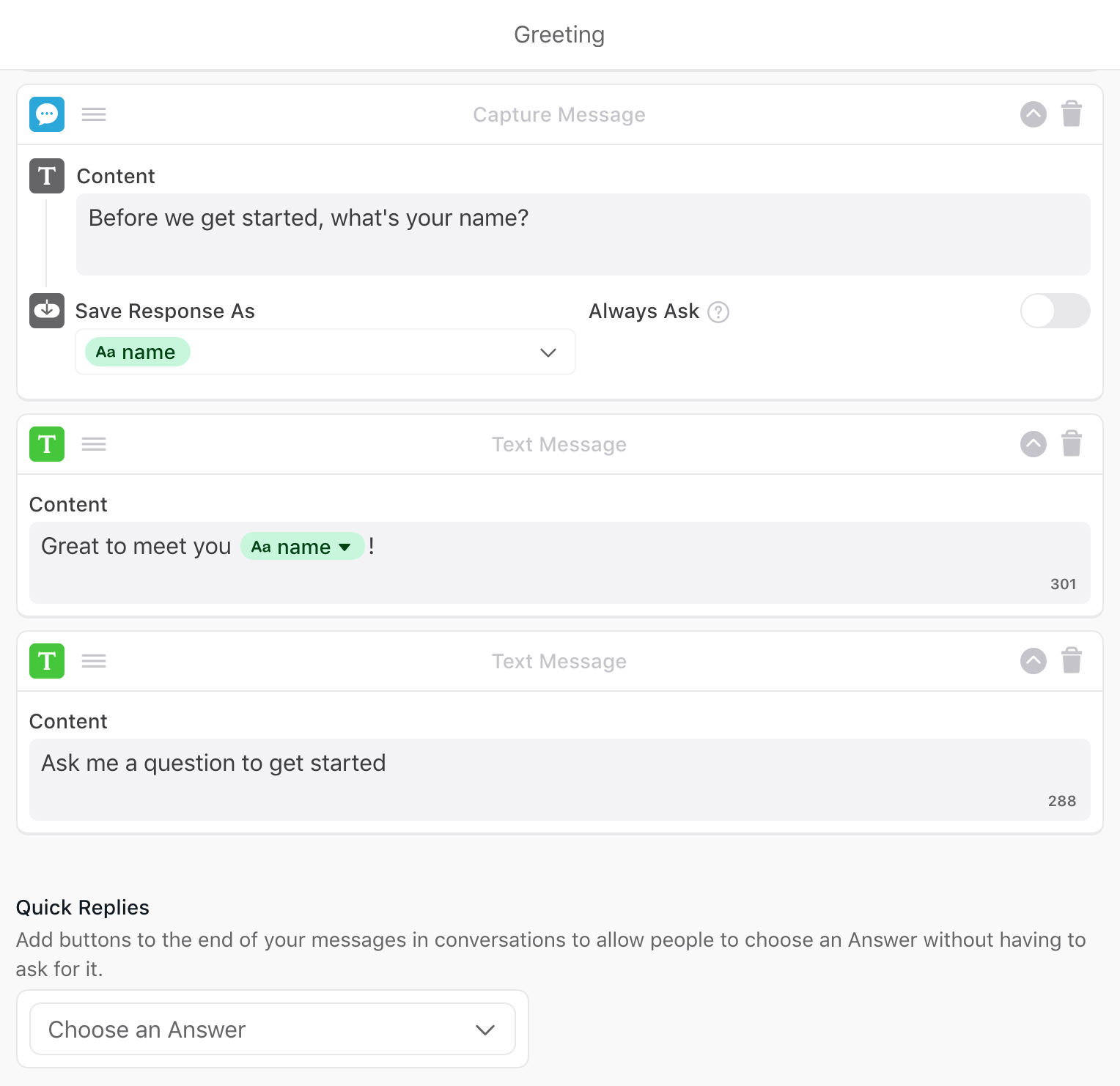 Example: Ask for a customer’s name and have the bot refer to that person by name going forward.